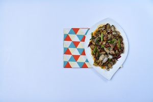 大火翻炒,最后放入香菜,翻炒几下装盘!