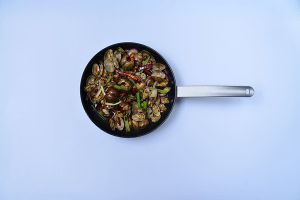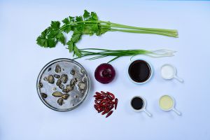 取锅入油烧热,倒入花蛤、葱、洋葱、干辣椒、香芹、生抽翻炒,再加入爱做的料、盐翻炒均匀即可。