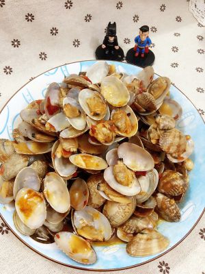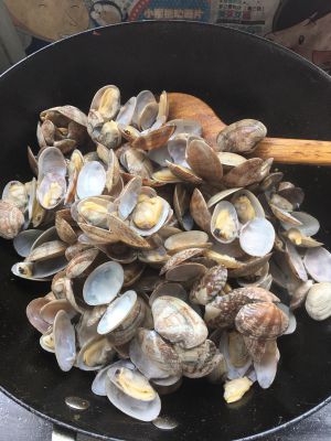 取锅烧热,将花蛤入锅煸炒,待壳自己开起,便将已开壳花蛤的取出,最后未开壳的可弃之,并将已开壳的花蛤用水冲净泥沙。