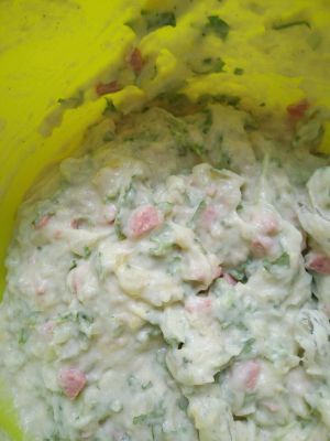 把备用的土豆丝、胡萝卜丝、葱花都加入到面里,面粉要调的稀一些。