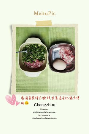 将青菜焯水,然后用纱布把菜绞干,切碎,香菇和豆腐干切丁。拌在一起,加糖、盐、胡椒粉和香油(香油适量,我们不能把馅料弄得太湿)。