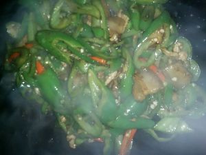 锅里放油先把肉炒熟放入姜蒜,再把备好得辣椒倒入锅中一起小火翻炒,然后适当的调味加一点蚝油,炒至辣椒变软就好ok了。