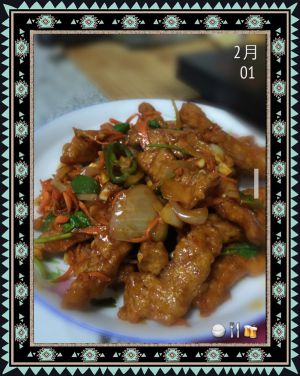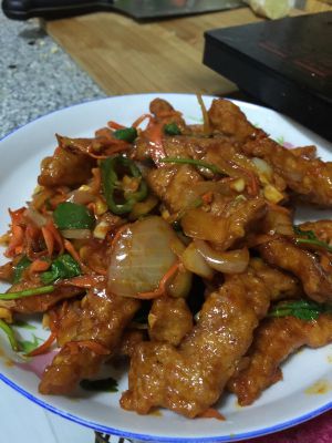 锅内留油少许 倒入大喜大糖醋酱和少许水 翻炒均匀后 陆续加入洋葱 尖椒 胡萝卜丝 然后倒入里脊 翻炒至上色均匀 出锅前倒入蒜末 翻炒几下出锅