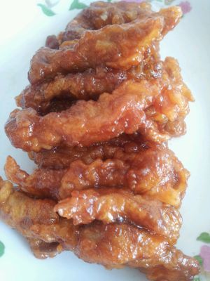 起油锅。把肉条蘸上面糊一条条放进油锅炸至金黄色。 全部炸完之后 。把油锅烧到九成热 再炸一变。