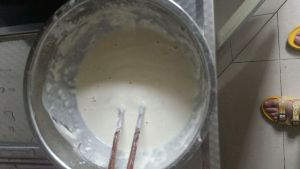 制作裹肉浆,玉米淀粉,面粉,1:1加去一个鸡蛋,加适量水,调至较稀