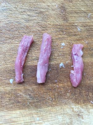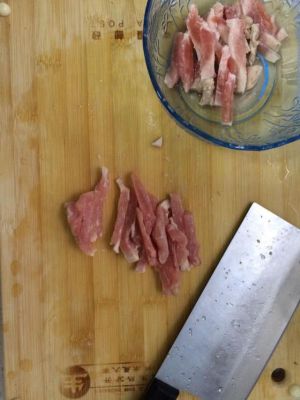 里脊切条,我切的太大了,加料酒,盐,腌一下