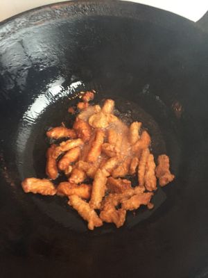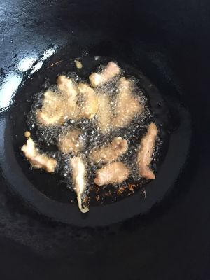 凉锅倒油,7分热以后(总之就是热了,也没有冒烟)下里脊条,调成中小火,心中默数50个数左右,夹出,里脊肉飘上来一般就可以了。