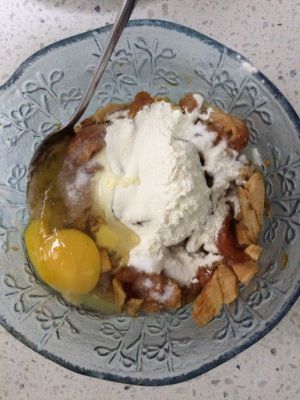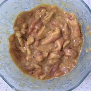 10分钟后(没有那么严格的时间限制啦),打入一颗鸡蛋,一勺面粉,少量食盐(刚刚忘记写上盐了!!!在这里加哦!)一个方向搅拌,里脊条裹上面糊就可以了,继续腌制5分钟左右,这个空挡来准备番茄酱。