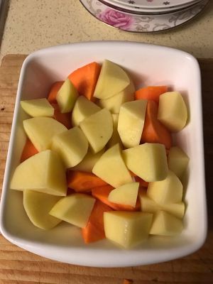 土豆、胡萝卜洗净去皮切一口大小滚刀块。加入砂锅中继续炖煮45分钟后,加入盐,搅动均匀迅速出锅。