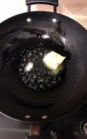 锅中加一点普通炒菜用油(花生油、菜籽油都可),溶化一大块黄油,直至黄油完全溶解冒出小泡。