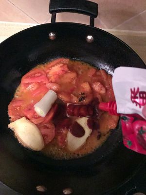 姜切片,葱切寸段,与大料一起放入锅中,加入三勺左右番茄酱,继续翻炒均匀,番茄酱融入其中,汤汁变红变浓稠。