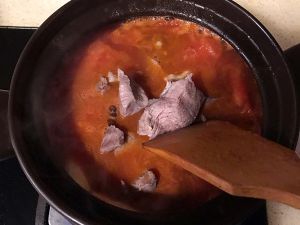 预热一个砂锅,趁热将这一锅西红柿汤汁倒入砂锅,放入飞过水洗净后的牛肉块,再次烧开后,转最小火,加盖炖煮2小时。炖煮两小时后,捞出煮烂的大料、葱段、姜片。炖煮期间要不时用勺子搅动,防止糊底。