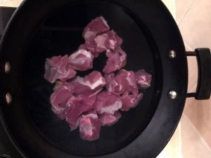 煮开后,出现大量血沫,倒入一勺料酒,晃动锅子捞出,用温热水冲洗干净牛肉块。