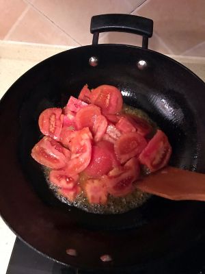 西红柿块迅速下锅翻炒,炒出变软,出红油。