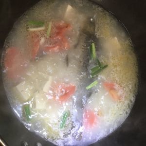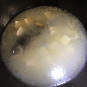 十分钟后汤已经变成奶白色了加入豆腐再煮三分钟。