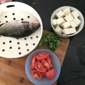 豆腐切正方形小块,番茄也切小块,香菜一点最后放,不喜欢吃的可以不放,香葱也切小段,照片没有拍上。