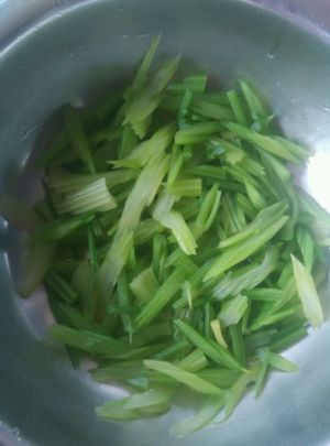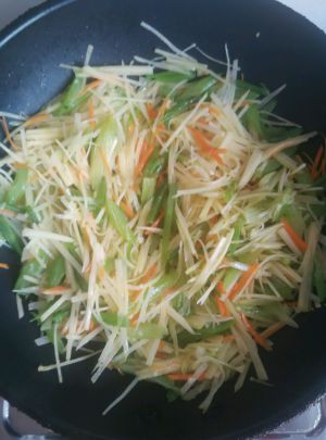 热油锅,放入葱蒜,胡萝卜丝,芹菜,土豆,翻炒!土豆变软后,放盐,味素出锅。简单美味!
