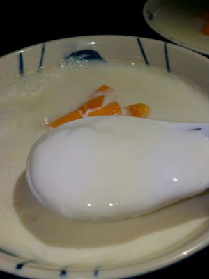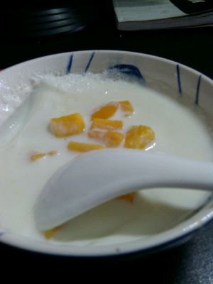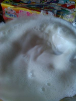把奶皮下面的牛奶倒进蛋清液中,留少许牛奶在碗内。(是为了避免因操作迟缓,底部的奶皮沾粘在碗底无法浮起。)
