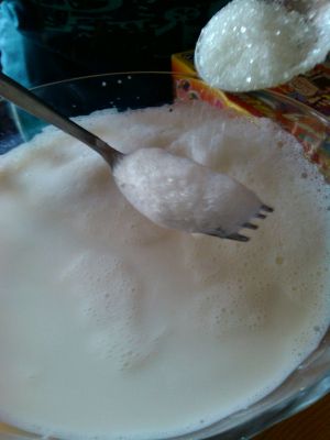 往大容器里的奶,加入蛋白,白砂糖搅拌均匀