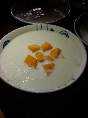 然后顺着之前划破的奶皮口,把混合后的牛奶蛋白液倒回碗中,此时碗底的那一层奶皮会自己浮上来。