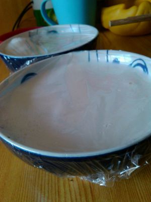 牛奶倒在碗中,封紧保鲜膜,放在水开的蒸锅里蒸5分钟,拿出来放在通风处晾凉。