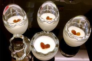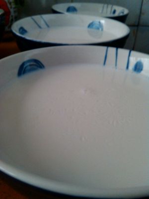 加热后的牛奶倒入容器中,放在通风处等待奶皮的形成。(这一层的奶皮是靠鲜牛奶的热气往上顶而形成的奶皮。)