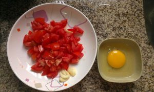 西红柿切块,蒜切片,鸡蛋打开。