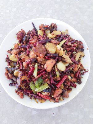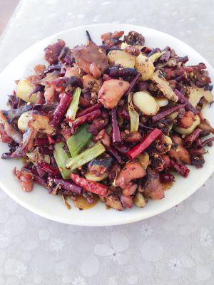 继续用锅里的油烧热,先倒入干辣椒、花椒、八角,翻炒几下后倒入准备好的葱段、姜片、大蒜翻炒,之后倒入炸好的鸡肉一起翻炒,待水分炒干后起锅装盘,香喷喷的辣子鸡就完成了!PS:上面是成品图,做的过程中因为准备材料去了忘记拍照。