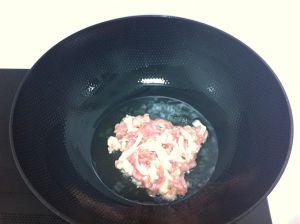 出香味后,倒肉丝翻炒至变色,盛出(不然肉会老)