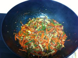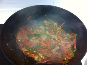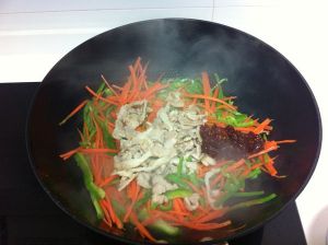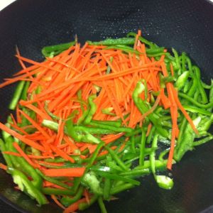 加入胡萝卜丝,木耳丝,尖椒丝翻炒两分钟,至胡萝卜目测变软(中火)