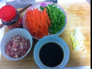 备材料 肉丝用淀粉 酱油和少许色拉油上浆 ,碗汁:(以白瓷汤匙为计量工具)白糖两平勺 陈醋(强调是陈醋)两勺 料酒一勺 酱油半勺