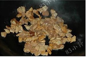 煨制入味的鸡肉丁倒入热油中快速翻炒炒至鸡肉变色即可盛出