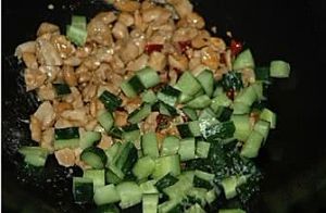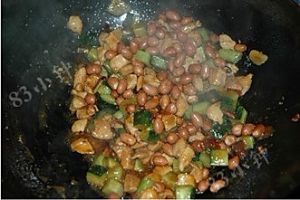 放入鸡肉丁和花生米大火快速翻炒