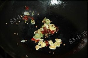 热锅下油,油热后,下入干红辣椒,花椒炒红,下葱姜蒜炒香