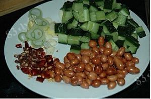 下鸡肉,出锅前加黄瓜和花生。