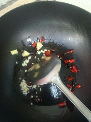 热油锅放花椒和干辣椒抄,在放姜片和蒜末
