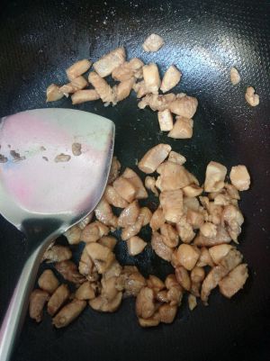 热锅,温油,鸡丁入锅,迅速划散,炒一会断生立即取出。
