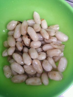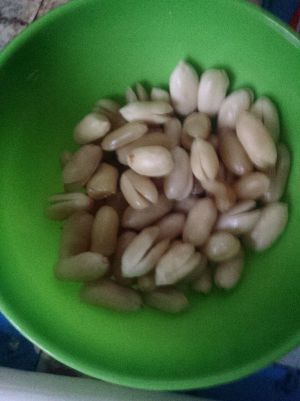 锅内倒入凉油,放入花生米,小火把花生米炒熟(不断的搅拌,不要把花生炒糊)