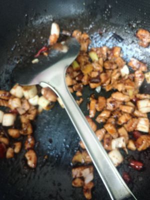 放入鸡丁翻炒均匀,放入黄瓜丁胡萝卜丁翻炒。放入花生米,豆瓣辣酱,炒出红油,放料酒。➕一点点鸡汤(可以用水代替)倒入调好的芡汁,迅速翻炒均匀。装盘。
