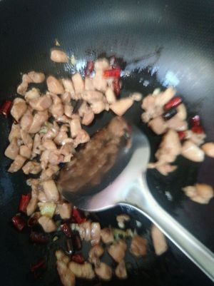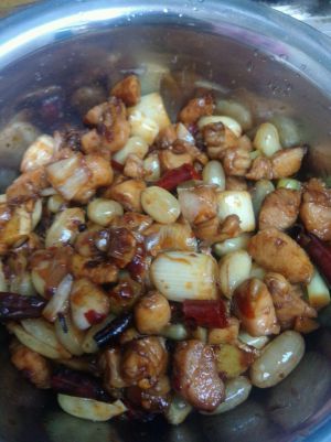 之后加入鸡丁跟花生,鸡肉变色时,用少许蚝油、醋、糖调味。