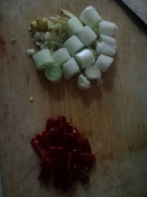 干辣椒、蒜切成几段。锅中油烧热后辣椒与蒜倒入,用小火煸炸出香味。