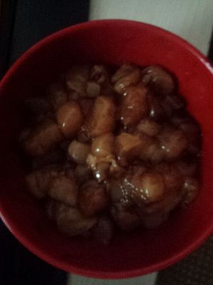 鸡胸肉切丁,放入生抽、盐、料酒与水淀粉拌匀。鸡腿肉也可,不过需去骨。