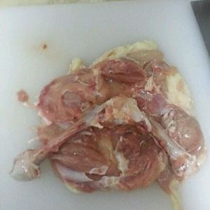 鸡腿 拿刀尖沿着鸡骨头划开,将鸡腿里的骨头去掉,去掉外皮和筋膜及小骨头。