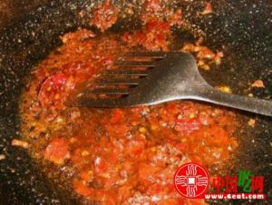 锅内倒油,放入郫县豆瓣酱炒香