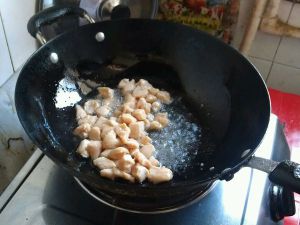 锅里放少许油,油温七八分热,倒入鸡丁爆炒