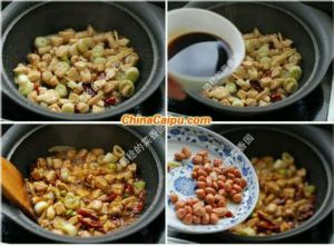 6:豆瓣酱煸出红油后,放入葱丁和鸡丁,倒入碗汁,最好放入花生米,翻炒均匀即可。