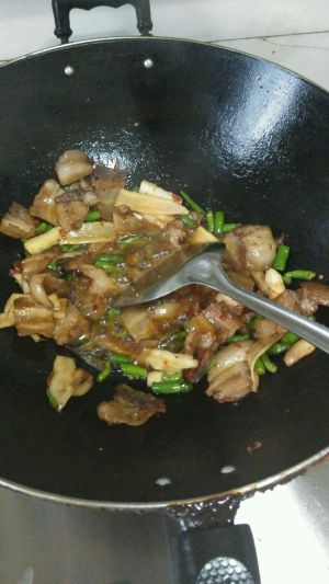放豆干,继续翻炒均匀上色~最后放入青蒜,变软后,即可出锅。