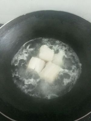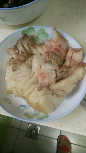 将准备好的五花肉切小块放锅里用水煮大约10分钟,取出后切片
