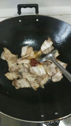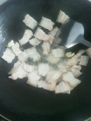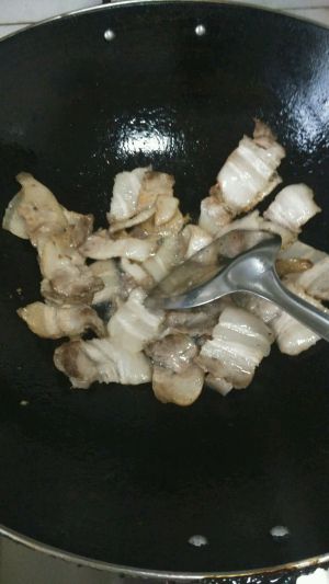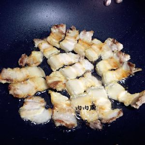 五花肉提前整条煮熟,放凉切片。锅中润少许油,下肉片煸炒出油,盛出待用。