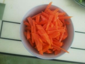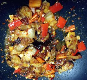 加入其他准备的青椒等,因为豆瓣酱的原因,已经比较有食欲了,因为家里有小朋友不吃辣,所以只放了半勺豆瓣酱,放多一点效果更好